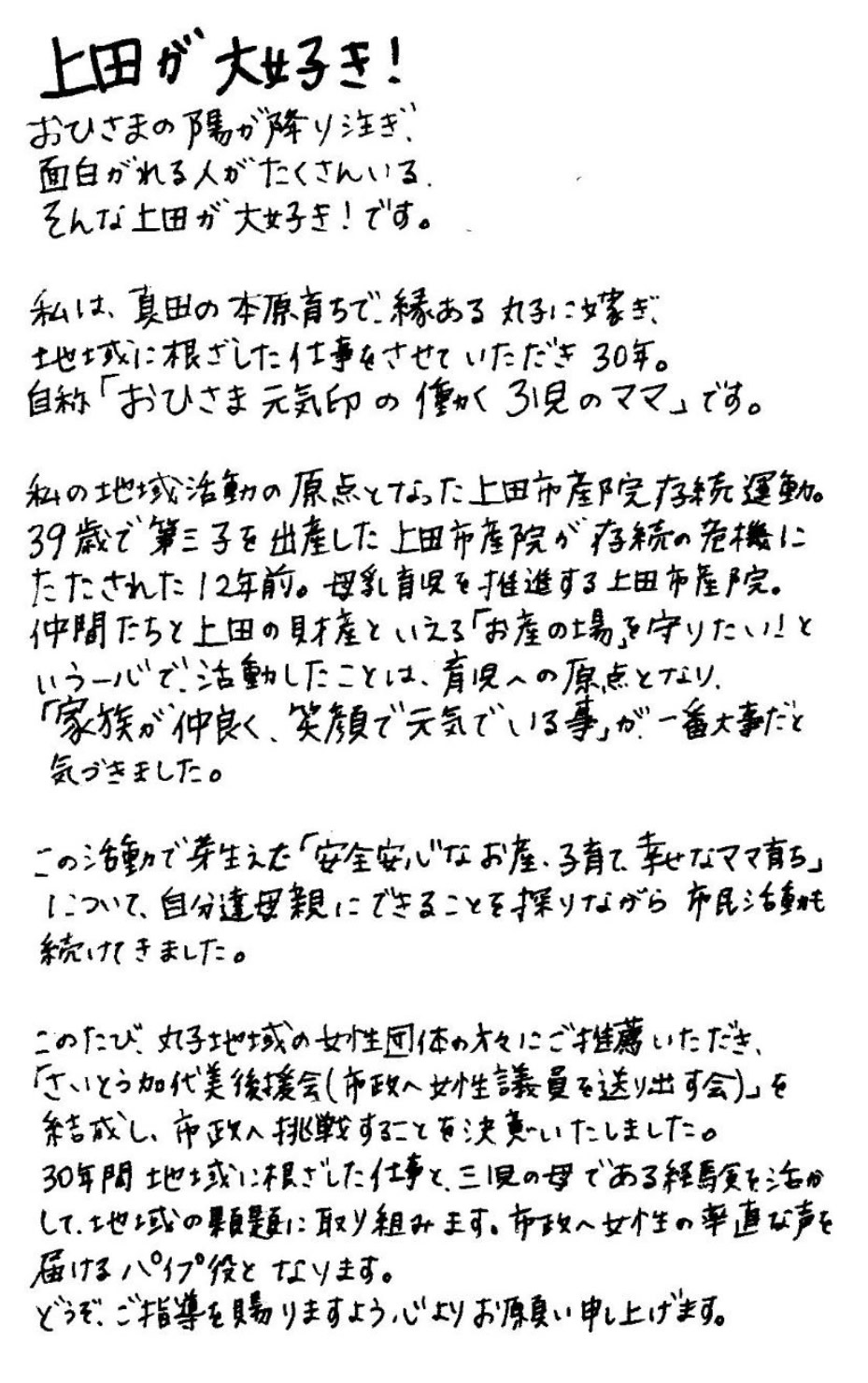 私は、皆さまのご意見を受け取り、市政へ繋げることができる大きな役割をいただいています。皆さまの声を市政に反映し、より良い生活に繋がるような施策へ結びつけるため努めてまいります。 皆さまのご指導、ご支援をどうぞよろしくお願いいたします。